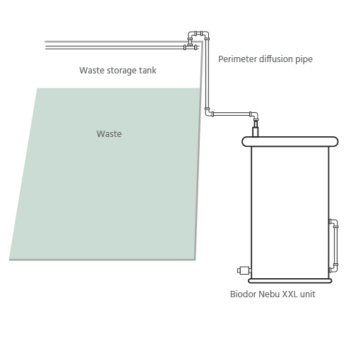 Biodor Nebu XXL is a dry vapour nebulisation system that disperses microparticles of neutralising agents directly over the surface of the pits or ponds. These microparticles react with airborne odorous molecules such as hydrogen sulphide, mercaptans and volatile fatty acids, neutralising them instantly and preventing their dispersion into the atmosphere.